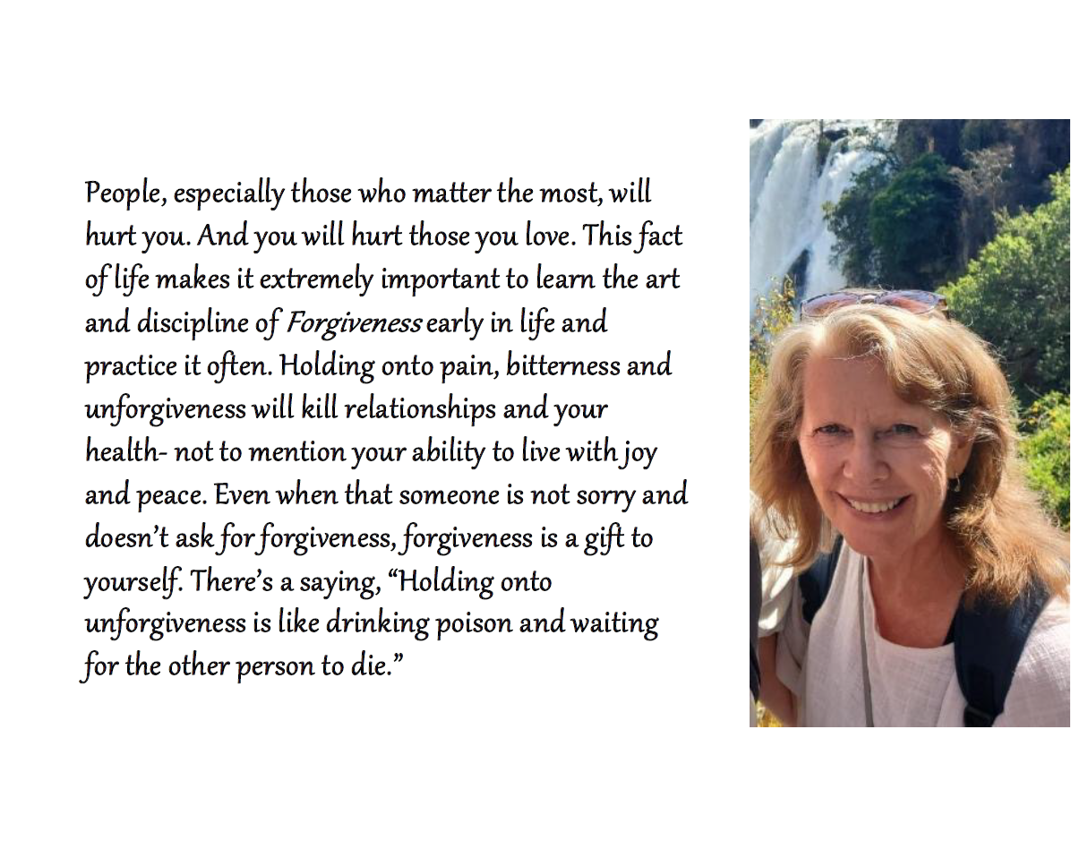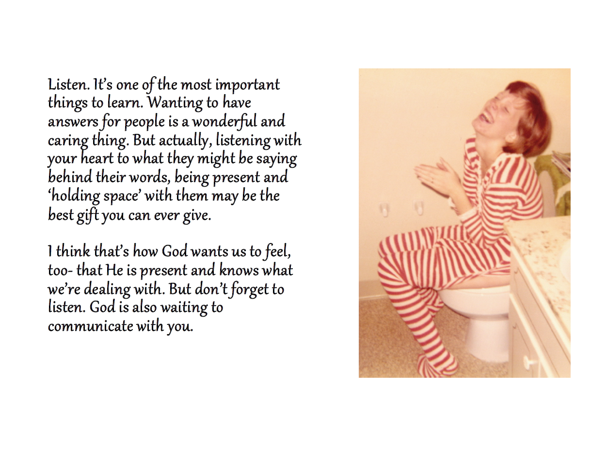 I’d like to share the gift with you as well. This will not be the most “profound” or “deep” thing you’ve ever read, but it does represent the distilled wisdom of a lovely and loving person after 67 years of life. I also gave each recipient a small stand; I keep my copy on my kitchen counter and flip to the next page each week. Whether you save these or simply reflect a moment on each one, you’ll be honoring their author and will enjoy some of the fun photos accompanying each page.
